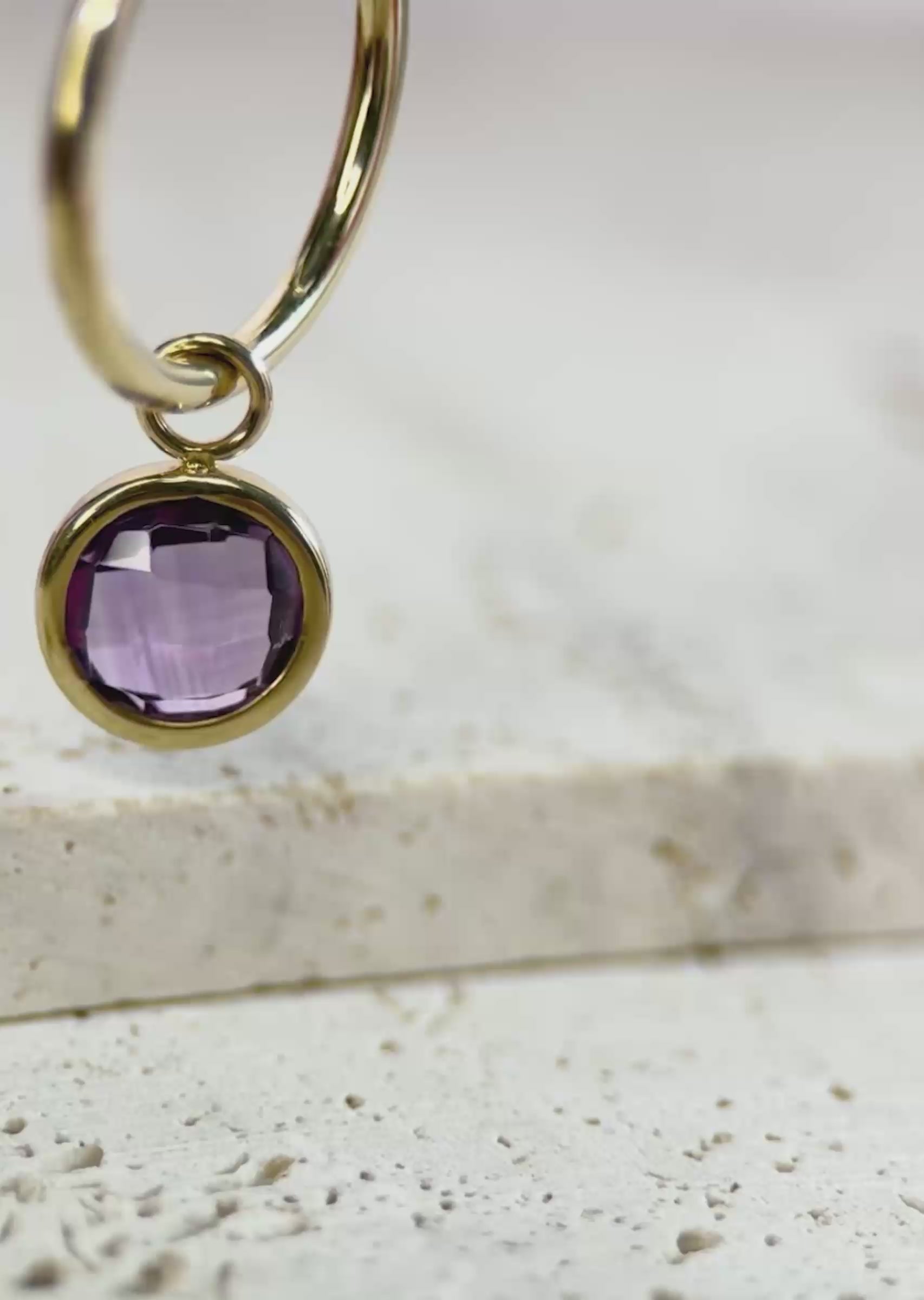 Elegante Creolen treffen auf einen Amethyst-Charm – eine Kombination, die du ganz nach deinem Stil tragen kannst. Entferne den Charm für einen minimalistischen Look oder lass sein sanftes, violettes Leuchten deinen Stil unterstreichen, wenn du subtile Schönheit zeigen möchtest.